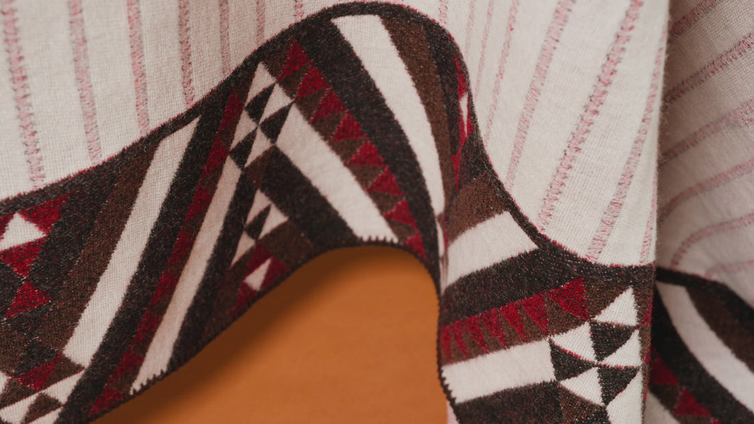 The body of the blanket is inspired by whakaairo, the art of carving, and reflects haehae, rows of ridges which are commonly filled with pākati (dog tooth notches). Whakarare is another common device in this pattern, where ridges are turned so that they cross and meet the ridge on the other side.